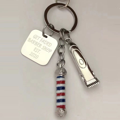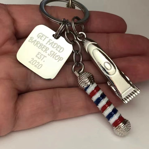 Barbershop pole key chain with Barber clipper charm. 3D pole thick metal.